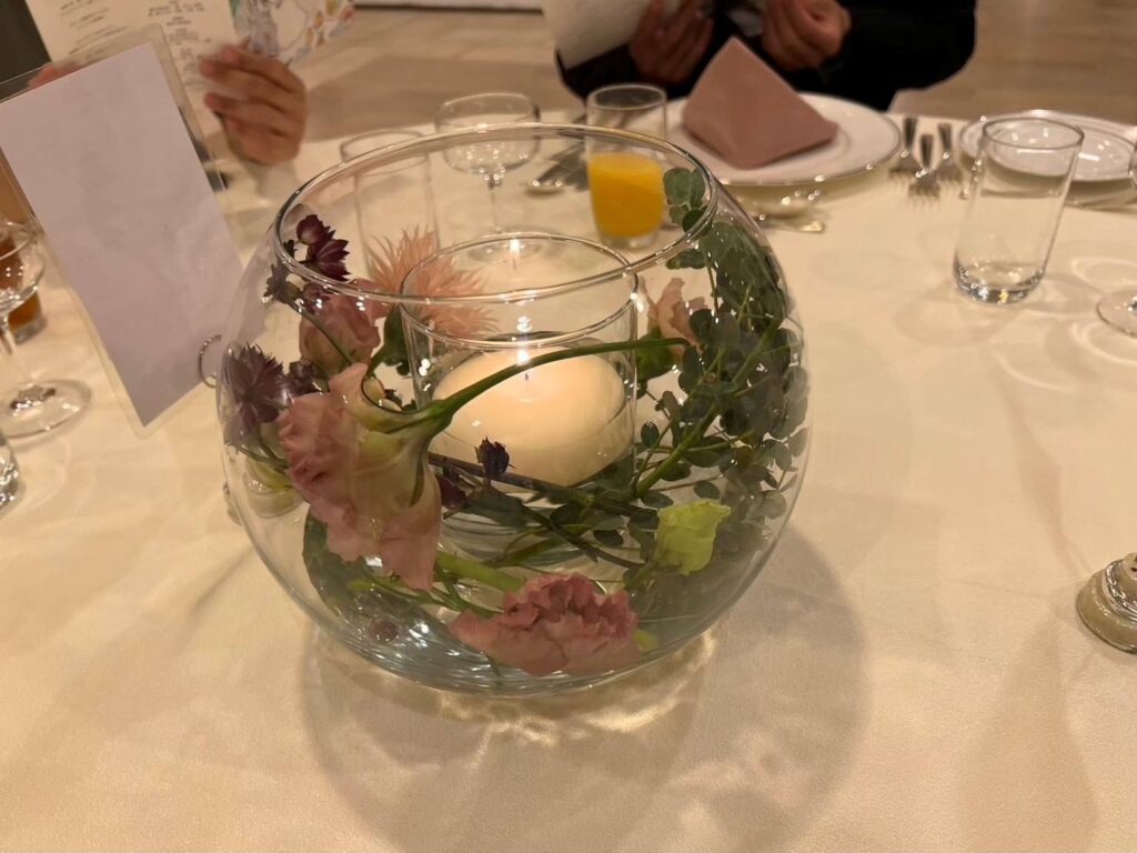 ⑤ ゲストテーブル装花(ガラスボール装飾)